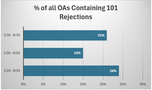 Interestingly, the rate of §101 rejections remained relatively steady for the next 3 years: 16% of all Office Actions had §101 rejections in 2021 and 17% of all Office Actions had §101 rejections in 2022 and 2023. However, that dramatically changed at the beginning of this year.