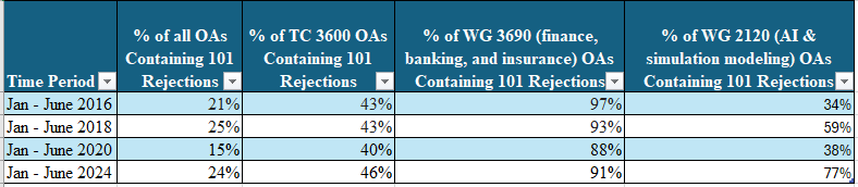 https://developer.uspto.gov/visualization/agency-trends-rejections-office-actions-patent-applications. The above table relies on the time period from January-June for ease of comparison with this year. However, those rates remained relatively similar over those years.